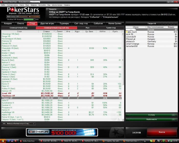 Пока на главной все паникуют у меня за столом 0.25/0.50 стад хай-лоу из восьми игроков пять из России. Никогда я не играл за одним столом с таким количеством русских. Кстати количество столов сегодня на этих лимитов особо не уменьшилось.