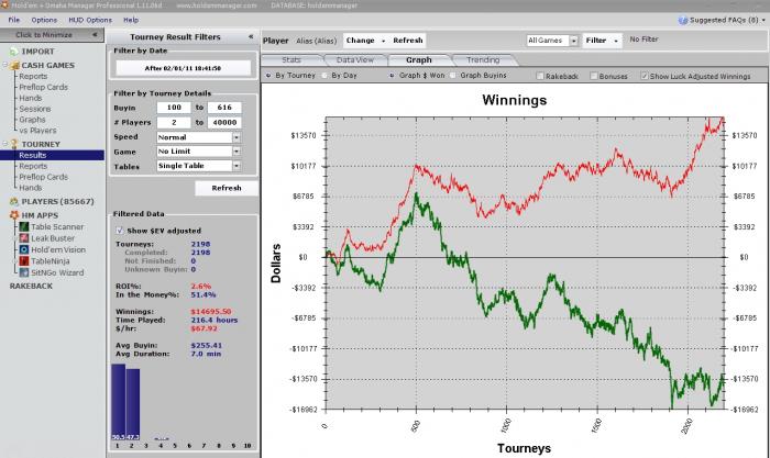 Привет, Джипситим. Я регуляр турбо ХА СНГ 200-300 на покерстарс и фтп. Перешёл на эти лимиты с 1 февраля 2011 и уже пару месяцев как нахожусь в даунстрике. В последнее время играл эти лимиты с очень агрессивным бр менеджментом. Играю более-менее хорошо, но не складывается и из-за этого регулярно сливаю 3-4турика в тильте. Агро бр менеджмент, топтание около нуля и невозможность осуществить покерные цели оказывает огромное давление, портит настроение и т.п. Поэтому я решил вывести часть бр и начать подъем с новыми силами и консервативным бр менеджментом. В связи с этим объявляю пари-марафон. Собираюсь выиграть 7.5к баксов без учета рейбека за 10 дней играя только сотки турбо на фтп и старзах. Идея взята отсюда http://forumserver.twoplustwo.com/185/heads-up-sng/prop-bet-10-000-55s-30-days-1009682/ Вкратце расскажу о том пари: парень поставил 2к против 8к (кэф 4 к 1), что сможет выиграть 10к за 30дней играя только 55 на старзах, т.е грубо говоря 200би за 30дней, 6.6 би в день. Я ставлю свои 3.5к против Ваших 10.5к (кэф 3 к 1) на то, что смогу за 10дней выиграть 7.5к, ~75би, по 7.5би в день. Первый график - сотки на фтп за всё время(на старзах почти не играл). Второй график фтп + старз с 1 февраля и по сей день.