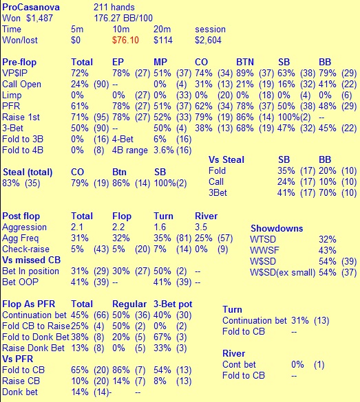 Оппонент префлоп играет, как совсем отъехавший, но на постфлопе относительно адекватен. Не боится крупно блефовать, любит побороться за поты. Я до этой раздачи играл достаточно тайтово, почти не делал 3бетов, поэтому надеялся остаться 1 на 1. Статы оппа в спойлере.