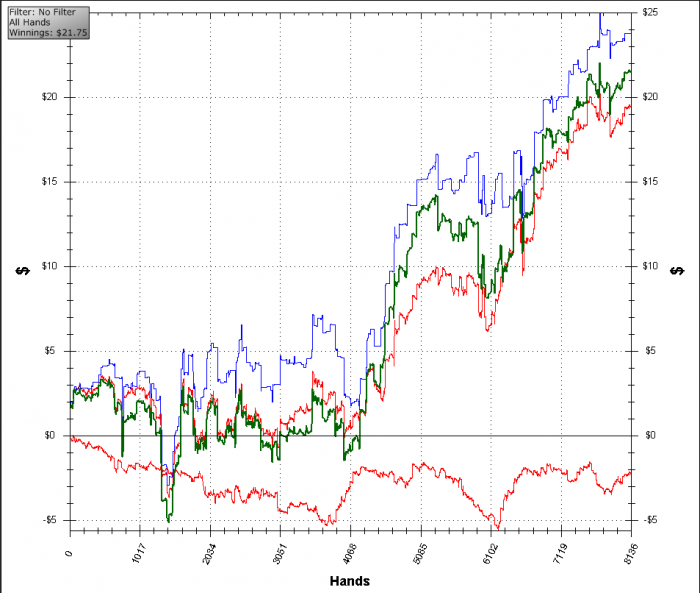 Задепозичено 40$ на PokerStars и отыгранно уже 8136 рук на NL2 с общим профитом 21,75$ (bb/100 13.37).