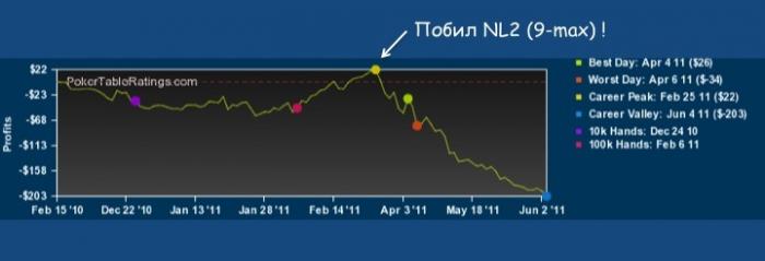 На NL5 (9max) я отыграл около 100 000 рук и на отметке минус 30 бай-инов что-то подсказало мне, что без софта мне его не побить.