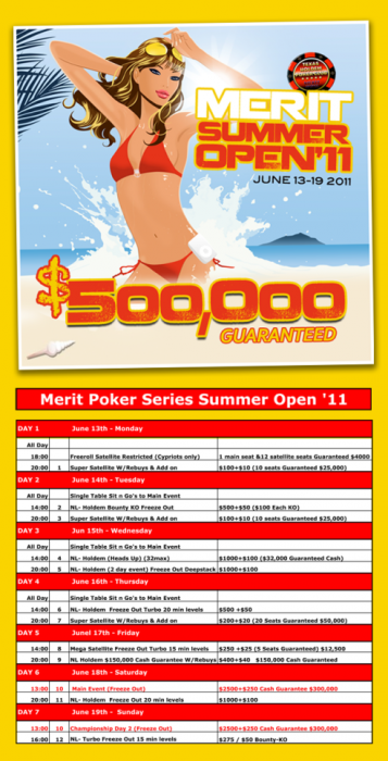 Компания Покер Клаб Менеджмент представляет турнир на Кипре Merit Summer Open 2011, с 13 по 19 июня 2011 турнир организовывают и проводят наши партнеры на Кипре Texas Holdem Poker Club и Grand Casino Club. Данный турнир пройдет в отеле «Merit Cristal Cove *****» .