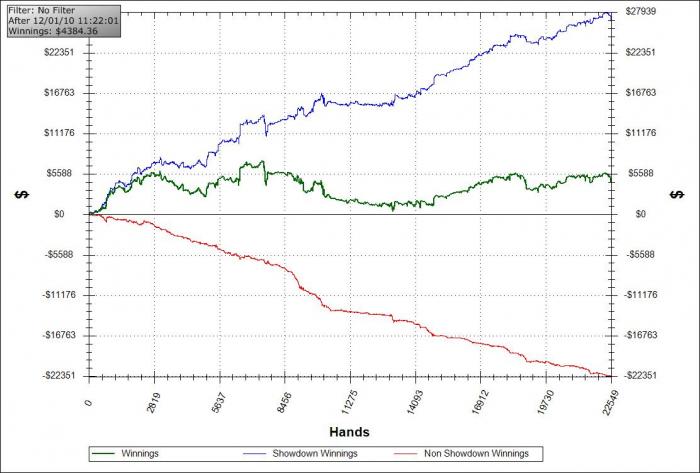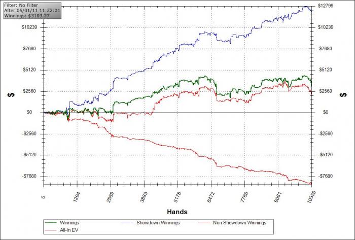 Я не спрашиваю, смогу ли я бить лимиты выше, т.к. еще и пло200 не побил с полной уверенностью. Вопрос в том, возможны ли такие показатели вообще. Есть подозрение (кэп подсказал), что чем выше лимит, тем меньше шоудаунов. Следовательно, при прочих равных, игрок с таким стилем как у меня, взял бы там за щеку. При том, что для оффлайна эти показатели вполне адекватны, т.к. есть необходимость разгонять банк на префлопе с широким диапазоном, имея преимущество и хорошо зная оппов и их теллзы.