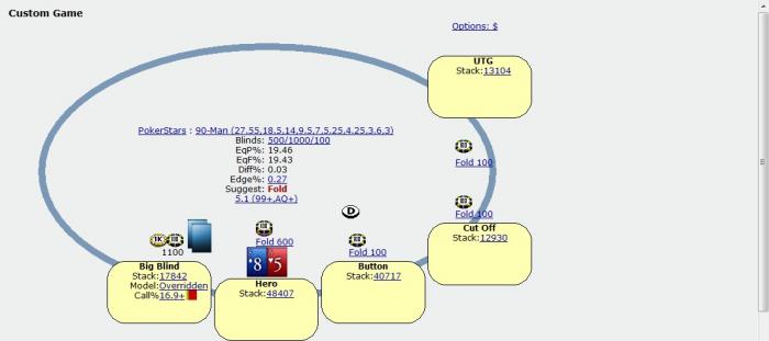 у бб KQs. динамика стола была такова, что чиплидер фиш после проигранного мне большого постфлопа сидел нитом (в какой-то момент стеки были у него 85к, у всех остальных, включая меня, по 10-15к), а я оупенпушил в шортов примерно 70% рук. пару кругов назад бб пихнул свои 10к с KJs с утг и удвоился против моих четверок. в общем колить ему тут или нет по ицм? мне в спектр он может спокойно положить топ-80% или даже шире