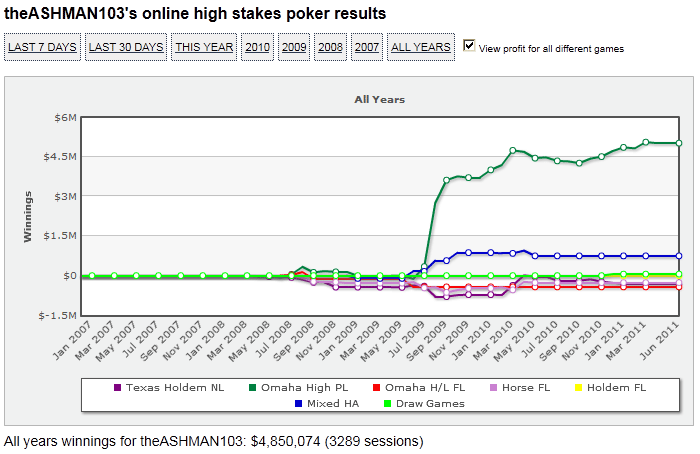 Также известен как theASHMAN103 - кеш-игрок (в основном, в PLO), знаменитый марафонскими сессиями, победитель хедз-ап чемпионата по $25к на Full Tilt, ну и конечно марафонец в буквальном смысле. Мне он очень интересен как человек, давно хотел с ним пообщаться - договорились сделать это примерно через неделю.