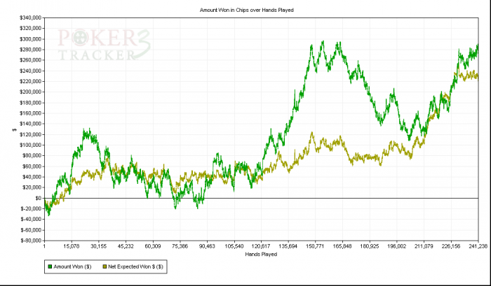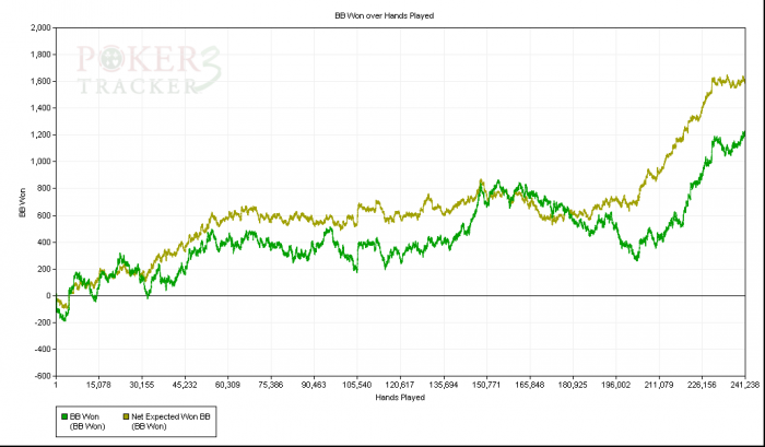 Выкладываю 2 графика Ev на длиной дистанции. Первый измеряется в ББ, второй - по фишкам. По ББ у меня недодача, в то время как по фишкам - наоборот. Вопрос: какой график более объективный для СНГ?