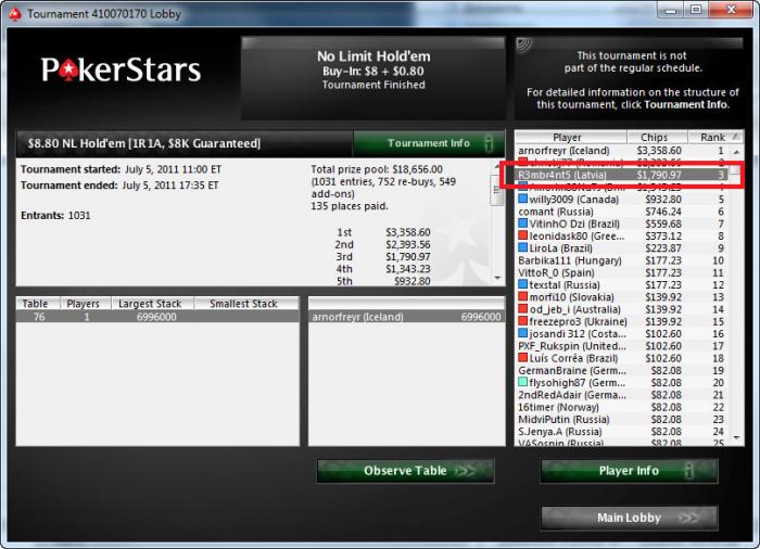 В айпокере играю почти только одни ребайники, но под время моей игры мне подходит только один 8к ребай. Позднее есть ещё, но их я редко играю, так как они поздно заканчиваются. Плюс иногда играю приватные турниры в различных румах, и тогда регистрируюсь с них, ники у меня разные почти везде. Самое большое количество турниров я сыграл в онгейме. (статистику выкладывал с тех ников, где побольше игры сыграно и где были какие то доезды, статистика примерно с октября 2010г.)