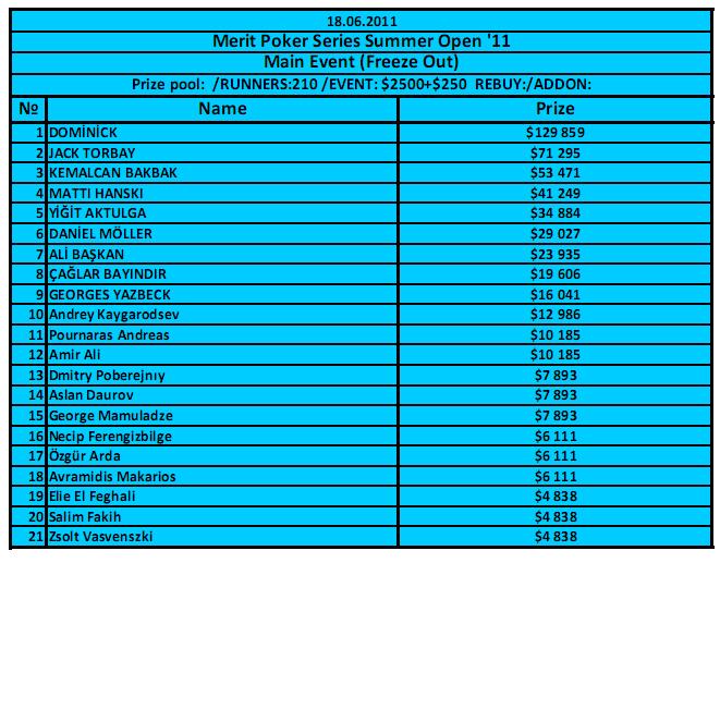 В общем, турнир получился просто отличным, а уже скоро будет следующий, который обещает стать еще лучше! С 1 по 10 августа турнир «Merit Cyprus Classic» , с гарантированным призовым фондом 1 000 000 долларов на всю серию и 750 000 долларов на Main Event!!!