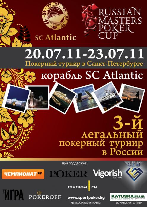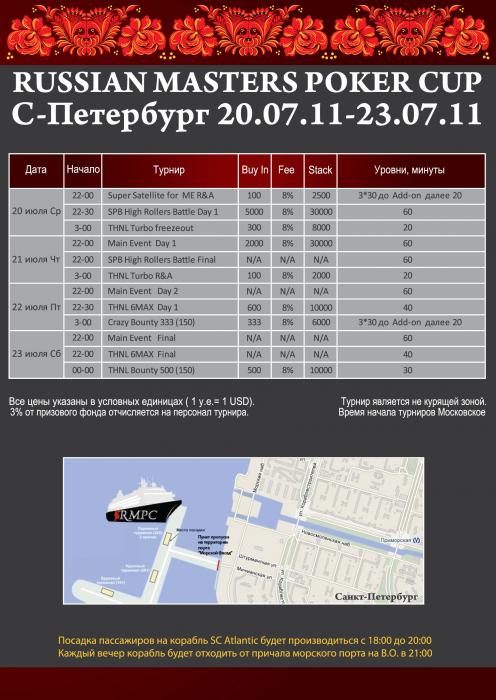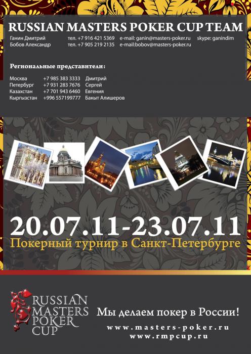 Приезжайте в Санкт-Петербург на серию турниров Russian Masters Poker Cup с 20 по 23 июля - наслаждайтесь Петербургом, ежевечерними шоу-программами и играйте в покер Легально! Подробности на наших сайтах www.masters-poker.ru (http://masters-poker.ru/) www.rmpcup.ru