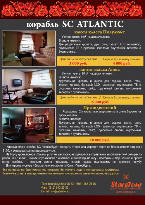 Мы сделали некоторые поправки по сравнению с первым турниром - так например время выхода корабля теперь в 21-00 т.к. прошлый турнир показал, что к 17-00 не всем удобно добираться до морского порта. Удалось договориться с менеджментом корабля о снижении цен на каюты.