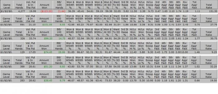 Дорогие коллеги! Несмотря на весь жгучий стыд, испытываемый мной по причине, которую вы узреете на приложенной картинке, я не вижу другого пути, кроме как обратиться за помощью к широким массам. Отыграв 4к рук и получив -1.5 ББ на 100 рук, я пришел к печальному выводу: фиш, который обязательно сидит за каждым столом и которого я почему-то не могу обнаружить - я сам Поэтому, я решил проанализировать, в чем моя фишевость особенно удается. С этой целью была сделана подборка, в которой, наряду с моими статами, присутствуют статы моих более плюсовых соперников.