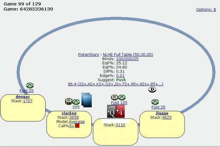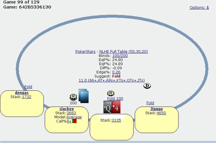 , сука,характерно, диапазон колла оппонента - все те же 9%. А разница в рекомендациях нефигственная получается.Типа на дистанции мне эти 100 фишек такую прямо выгоду принесут? Какая здесь логика, не растолкуете? Спасибо.