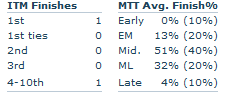 Теперь в кратце. Сыграно пока что 217 турниров по 3 румам за месяц. Я считаю что это нормально, посколько я никогда не играю больше 6 окон. Стараюсь играть в основном только 4. Что бы не терять динамику стола. Профит пока что минусовый, но думаю все будет тип-топ. Всем спасибо кто будет читать отчет и болеть за меня в трудную минуту.