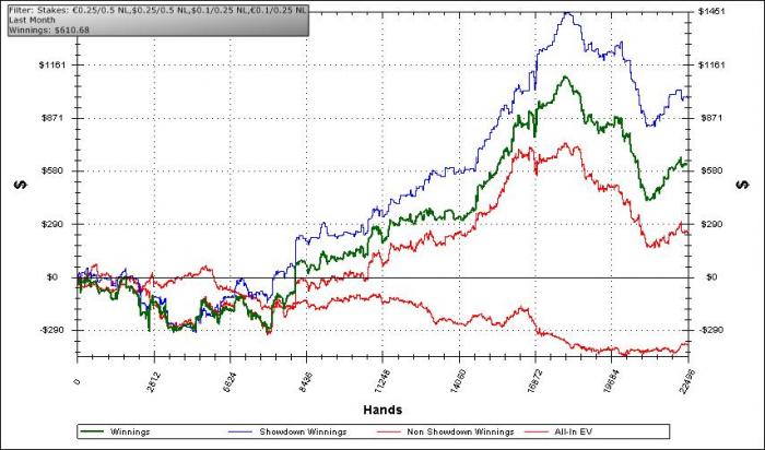 Депнул 200$ на старзы и начал по чуть чуть катать кэш NL10. Быстро побил этот лимит и перешел на NL25 где в принципе сейчас и играю. Выиграл уже много (что-то около 3000$) но постоянно выводил деньги, т.к. 10 месяцев болезни больно ударили по моему БР. (практически его убили). И мне стало интересно можно ли постоянно выигрывать хотя бы 1000-1500$, играя по 1-2 часа в день, но каждый день. И оказалось, что можно. Месяц назад начал опять играть в офф-лайне и как-то пошло накатом, я быстро наколотил комфортный БР для NL200$ (5000$) и даже иногда играл Nl500$. И в ожидании 100тысячной руки в интернете я имею вот такие результаты.( рис. 1) Теперь я не знаю, что делать дальше с он-лайном? Играть дальше так же по 2 часика в день, стабильно плюсуя тыщёнку в месяц(типа зарплаты), стараться вырасти по лимитам (хотя бы до NL100 или NL200) или бросить нафиг и погрузиться опять в офф-лайн???
