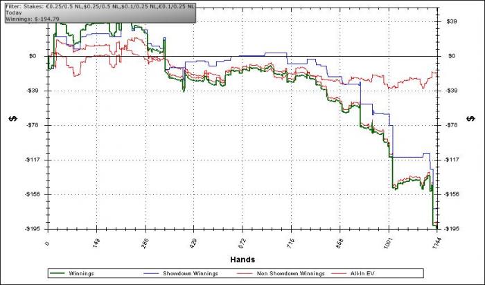 Всем привет, давно хотел завести блог. Я профессиональный игрок в оффлайне в покер. Играю уже 4 года из них 3 профессионально (зарабатываю на жизнь покером). В оффлайне начинал с турниров по 200руб. и кэша 10-20руб. Результаты были просто отличные: быстро поднялся по лимитам и стал играть все турниры, проходящие в моём городе, иногда выезжал на турниры с БИ больше 1000$ (играл сайды на EPT, EMOP, RPS) и в кэше вырос до NL1000$. Но год назад мне пришлось временно завязать с покером по причине болезни. Итог: 3 операции на сердце. Я почти год не играл. Потом я захотел все таки научиться выигрывать в он-лайне, а то всегда туда заносил по 200-300$ в месяц, что было малой частью моего заработка и было всего лишь развлечение. Депнул 200$ на старзы и начал по чуть чуть катать кэш NL10. Быстро побил этот лимит и перешел на NL25 где в принципе сейчас и играю. Выиграл уже много (что-то около 3000$) но постоянно выводил деньги, т.к. 10 месяцев болезни больно ударили по моему БР. (практически его убили). И мне стало интересно можно ли постоянно выигрывать хотя бы 1000-1500$, играя по 1-2 часа в день, но каждый день. И оказалось, что можно. Месяц назад начал опять играть в офф-лайне и как-то пошло накатом, я быстро наколотил комфортный БР для NL200$ (5000$) и даже иногда играл Nl500$. И в ожидании 100тысячной руки в интернете я имею вот такие результаты.( рис. 1) Теперь я не знаю, что делать дальше с он-лайном? Играть дальше так же по 2 часика в день, стабильно плюсуя тыщёнку в месяц(типа зарплаты), стараться вырасти по лимитам (хотя бы до NL100 или NL200) или бросить нафиг и погрузиться опять в офф-лайн??? Просьба всех, кто зашел на эту страничку ответить в опросе. Заранее спасибо!