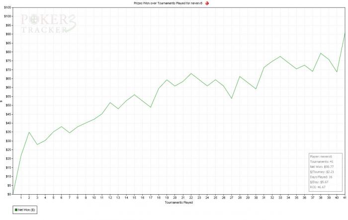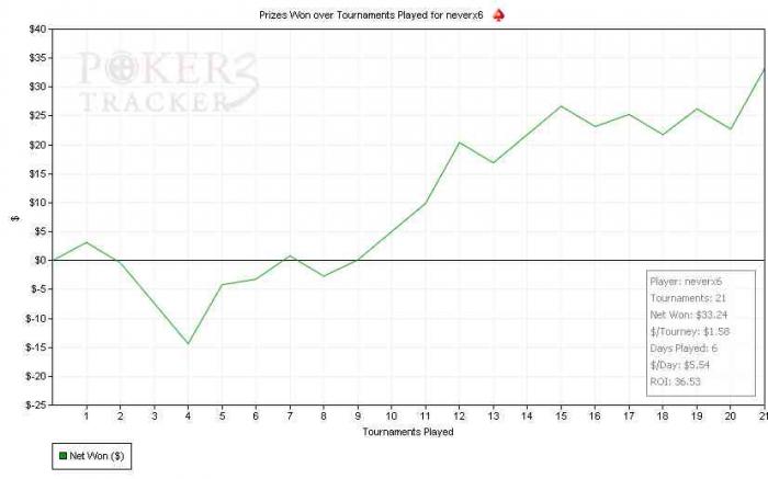 Появилась мысль поставить себе план на день и забивать в день по крайней мере 20 гринов чистого профита (стоп-лосс поставлю себе тож 20 в день, типа откат на день назад). Играю СНГ 3.50 и 7 (9-макс) не по БР. МТТ нравятся меньше ибо дисперсия, дисперсия и еще раз дисперсия, хотя в свое время выиграл фриролл 1 место на фуллтилте 7500 человек и получил целых 18 долларов, кста там же брал еще 2 и 6 место.
