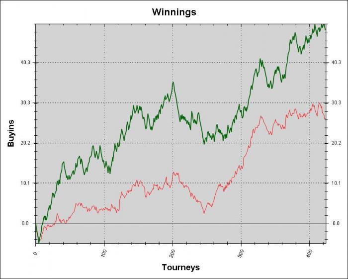 Берем график только с зеленой линией (так они, например, на шаркскопе представлены). Если наиграна большая дистанция, то рои позволяет рассчитать точки, где будет находиться наш профит на отметках в 5К турниров, 10К турниров, 20К турниров и т.д. Через эти точки проводим прямую (поскольку все точки рассчитаны от одного и того же рои, то получится именно прямая). Так вот отклонения реального графика вниз от этой прямой, проведенной через расчетные точки - это и есть просадки. И, совершенно верно, чем ниже рои, тем чаще и глубже эти просадки могут случаться.