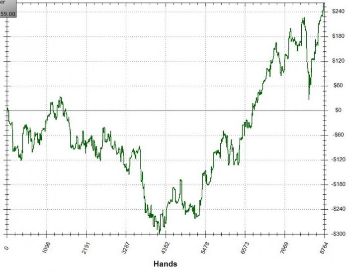 Внесенные изменения в игру вроде дают свои плоды. В первую очередь снизил впип и пфр, а также стараюсь не переигрывать мелкие сьюитед коннекторы и другие "красивые" карты, хотя удается это с трудом =). По-прежнему серьезные утечки профита возникают из-за плохой дисциплины и тильта, но и в этой области намечается прогресс. Еще не могу определить насколько пагубно сказывается фоновая музыка, но есть ощущение, что она сильно влияет на обдуманность многих принимаемых решений.