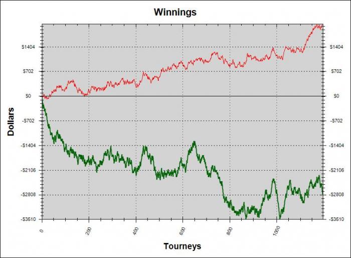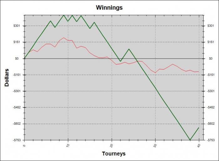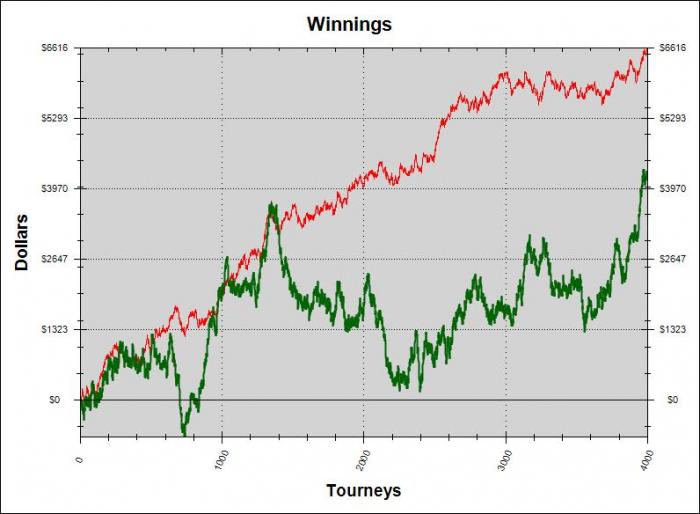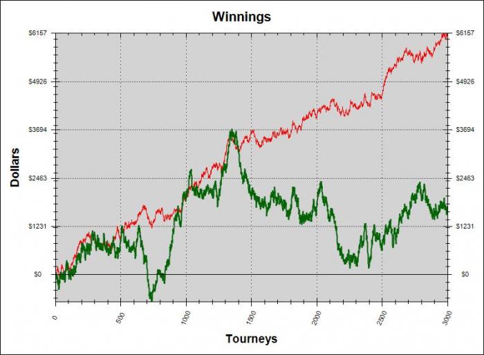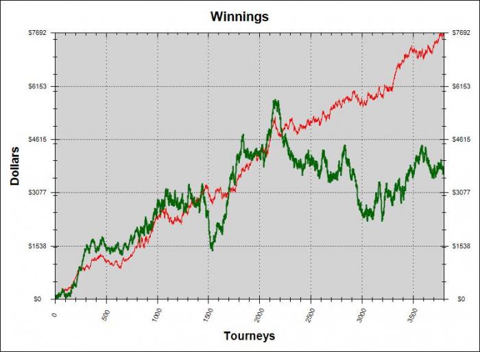 Еще раз всем привет! Пора подвести кое-какие итоги, так как я сыграл знаковое для СТ ХА снг количество игр, а, именно, 3к. Считается, что ЕВ рои на этой дистанции отражает реальное положение дел. Собственно график Только 60ки 60+30 Если бы не недобор в 73БИ играл бы уже 100ки Ев РОИ на 60ках 3,4%. Кстати, говоря, рассчитывал я на 1,7-2%. Так что я молодец. Надо отметить, что сейчас я играю 2 стола. Во времена ФТП я играл 4 и РОИ был заметно ниже. Так что, хочу посоветовать всем, играть определенное удобное для себя количество столов Продолжаем гриндить! Всем удачи!