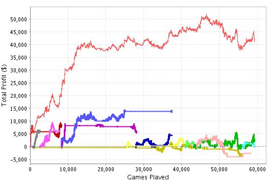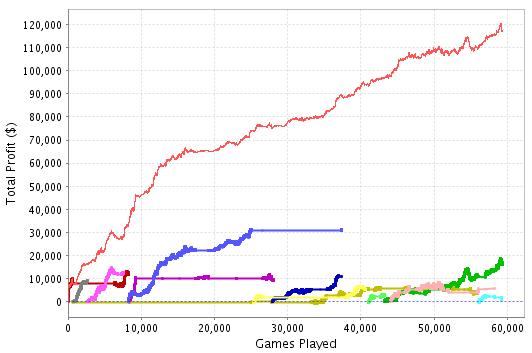 50e (71$) на графике апстрик, реальный roi 2-3% за 5000 игр.