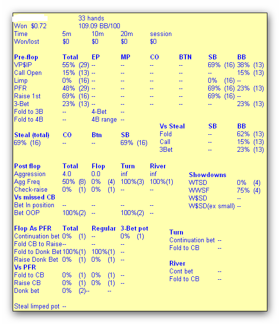 3бет = 23% от 13-ти. 13 - количество возможностей для 3бета, а процентное отношение - кол-во сделанных 3бетов. Так что 3бетов было 3.