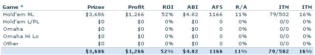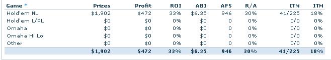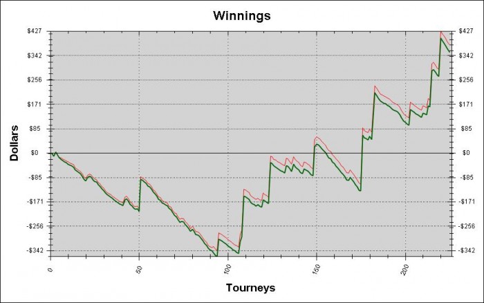 UPD: Проанализировал месяц в целом. Сыграл всего 225 турниров (но что-то из-за учебы и работы не играл где-то дней 10 в середине месяца). Первые 150 турниров за месяц был в минусе. Максимум просел до -342$, но в итоге месяц в плюсе на 500+$. Цели на новый уже в выходные поставлю, как и полный анализ месяца сделаю.