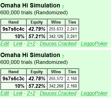 В одном из видео магический ниндзя размышляет о разнице в силе таких рук как 9s7s6c3c и 9s7s6c4c, заявляя что якобы вторая рука из-за 4ки намного сильнее и предлагает зрителям сравнить эти руки в propokertools.