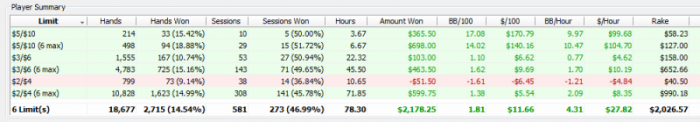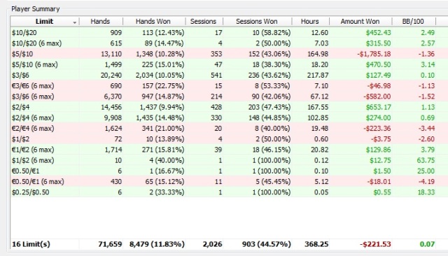 С лета, когда я начал добавлять короткие столы, слабоплюсовая игра скатилась в нулевую. Этим я конечно не могу быть доволен, как и вялым прогрессом в игре в целом. Поэтому сейчас основной целью является именно интенсивное развитие и покорение лимита за лимитом.