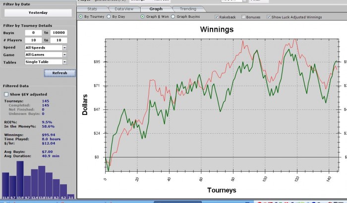 Вроде потихоньку начало отпускать. вчера в плюс 100 сыграл, там правда жутко кулерило против меня. Но мои ТТ против JJ+ вчера были непобедимы. по ев в плюс 20 а профит в плюс 100. сегодня самочувствие плохое, да и что то ниндзя глючит, выдает обновление. Но обновление не устанавливается. отыграл сет из 24 турниров в плюс 67 и закончу на сегодня. Нужно по итогам года золотую звезду заработать в шаркскопе в лидерборде