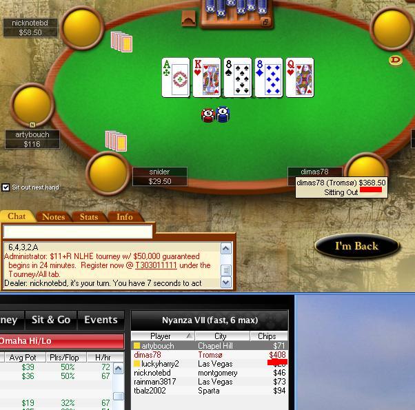 По-моему, это мой личный рекорд. На одном столе выиграл больше трех заявок, на другом - больше четырех (закупаюсь $80 всегда). Может, и правда надо больше катать? Сыграл 2223 руки, что тоже, кстати, рекорд.