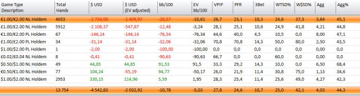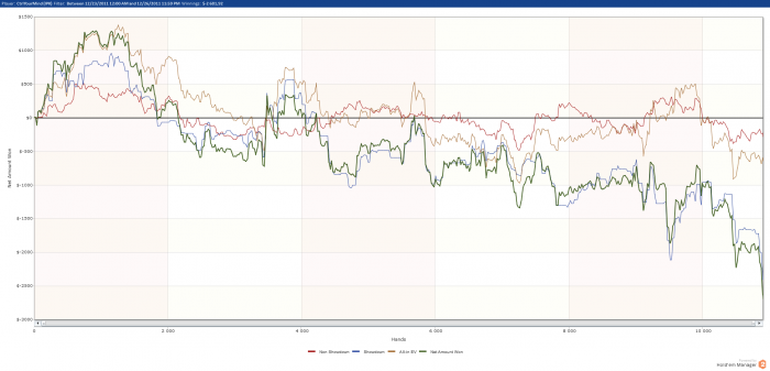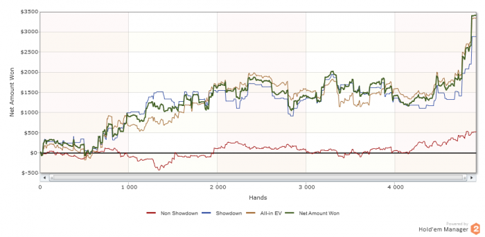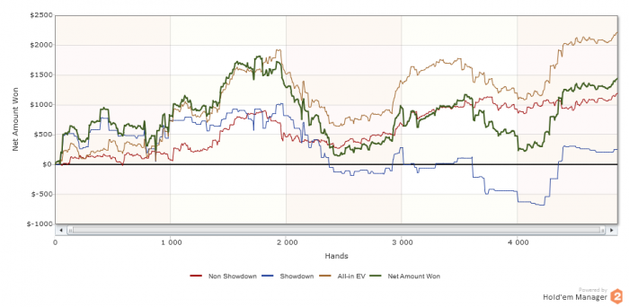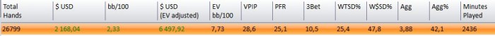 Втсд 25 для меня, вечного телефона, это подвиг, никогда я не показывал такой норм игры (которая по абсолютной оценке все равно не очень), и не делал таких фолдов, но w$sd 42 делает свое дело (хотя бывало и хуже). И это только вершина айсберга, малая часть от всей жести, которая твориться со мной уже 3ий месяц. Всего залито от пика 52к, 34 из них недодача.