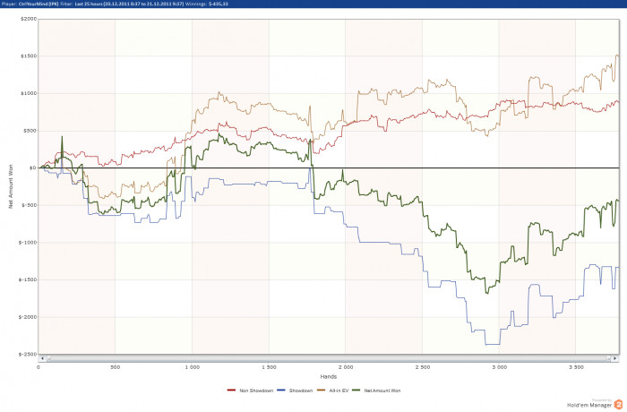 Тут есть пара моментов: 1) Это уже длится уже почти полный 3-ий месяц, если я буду мало играть, может еще на 3 затянуться, судя потому, какой величины могут быть стрики, как пишет Форхалей. Стрик в 300к рук это 3 месяца по 100к. Я где-то за 2 предыдущих сотню откатал, осталось еще две 2) Еще много завязано на моем скилле, как я уже упоминал, играю я очень посредственно, и прекрасно сознаю, что действительно хороший игрок на моем месте, попав даже в такой жесточайший стрик, вместо 52к залил бы всего 20, а по ЕВ вообще бы в плюс шел. Так что я понимаю, даже в таких условиях вполне возможно выживать и даже не просто выживать, а чуть более чем выживать, и главное очень четко вижу за счет чего я могу играть лучше, уменьшать потери, и очень хочу этого добиться.