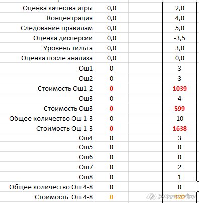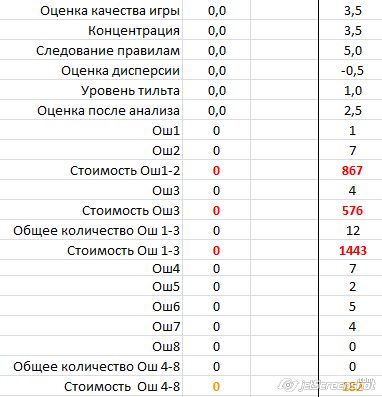 Шкалу юзаю от 0 до 5, с шагом 0,5. Как видно по ощущениям мне казалось что я играл достаточно хорошо (первая строка), в хорошую B-игру, но в результате оказалось что натворил кучу ошибок, и показывал максимум удовлетворительную B-игру, а может быть даже и C-игру, но в сочетании с общим уровнем игры, думаю можно поставить 2,5 балла (блин, 2,5 балла это и есть C-игра ). В общем играл неплохо в целом, но делал много ошибок (стандарт впрочем для меня).