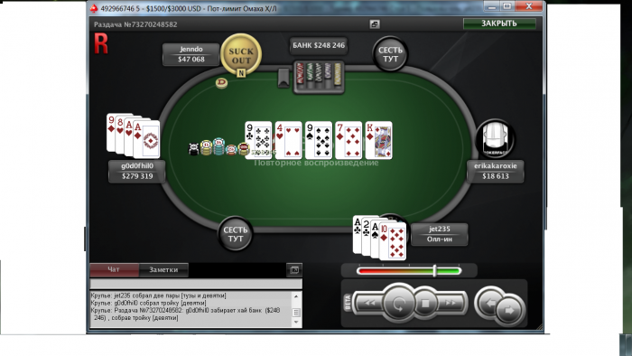 06.05 $11+R PL Omaha H/L 1KGtd - аут(бился хорошо, пару раз удачно в поздней стадии удвоил свой короткий стек, вылетел на предбабле 11/9, стек был 9-й, пол часа никто не хотел вылетать, чтобы стек не умирал решил играть активней - не повезло) 063.5 $5.50 PL Omaha H/L 500 Gtd - аут( также на предбабле, на флопе натс стрит JК был побит гатшотом AJ108, тёрн король) 10.35 $5.50+R FL Omaha H/L 750 Gtd - аут( тут без коментарий просто 0) 12.05 $11 PL Omaha H/L 500 Gtd - аут(играл вроде норм чуть-чуть неповезло, с одним из бекеров сидел за одним столом в конце турнира) 13.05 $5.5 NL Omaha H/L( ante up) + 80$( 2-е место из 70) 15.05 $16.50 PL Omaha H/L 500 Gtd + 163.87$(4/115, когда осталось топ 4, стеки были примерно равные - один тип делить отказался было бы 288$. Потом этот тип, что отказался чуть не вылетел, остался каратышом. Когда стеки были: 1-й=150к, 2-й(я)=120к, 3-й=47к, 4-й=20к случилась вот такая раздача