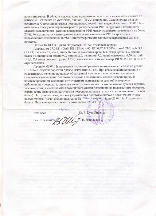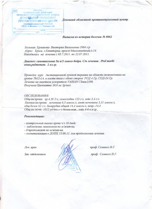 В марте 2011 года у меня сильно начала болеть поясница, мне провели обследование и направили на лечение в Донецкий онкоцентр. Поскольку я сама доктор, и понимая всю серьёзность своего состояния, я написала письмо в клинику Израиля, чтоб узнать, есть ли более удачные варианты моего лечения. Меня пригласили на обследование. В клинике поставили диагноз Нейрофиброматоз, который озлокачествляеться редко (3-11% заболевших) и я попала в эту группу"везучих" людей! Врачи назначили лечение. Первую линию химиотерапии я уже прошла (сумма затрат 26000$). Сейчас необходимо пройти повторное обследование и возможно вторую линию химиотерапии. Средств на это нет... Я сама по специальности детский анестезиолог и борюсь за жизни. ОЧЕНЬ ХОЧУ, ЧТОБ И МОЯ ЖИЗНЬ БЫЛА СПАСЕНА! Я буду рада любой Вашей помощи! Спасибо большое!