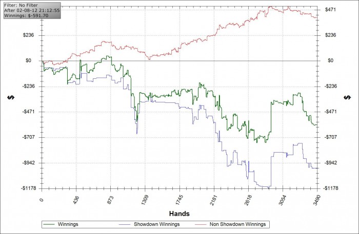 Почему так? Заметил что где-то 1.5 - 2 часа катаю с нормальной концентрацией, "вживую" как-то - хз как объяснить. Ну, т.е. постоянно работают мозги, понимаю что происходит, понимаю что "рисую" и что рисуют мне. Потом начинается "роботека" - стандартные линии, автоматические раздачи. Вот этот большой пот и был разыгран в роборежиме. Еще и в состоянии микротильта, после нескольких проигранных префлоп олынов 70/30 и 80/20.