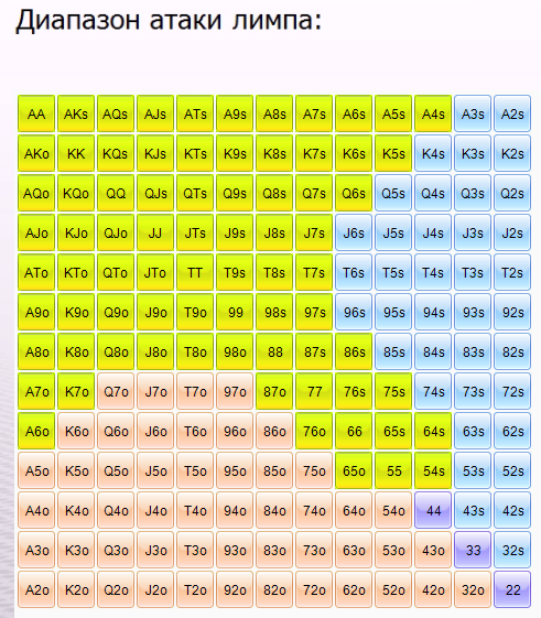 Не я этот чарт составлял. Я лишь говорю, что я его проверил на себе. 22-44 остаются по-видимому, чтобы у нас были какие-то сеты в чеке его лимпа, и во второых, без попадания они очень тяжело играются без позы. 55-77 и коннекторы нужны для баланса всего этого диапазона, потому что если только с бродвеем атаковать лимп, то низкие флопы нам не будут подходить никогда.