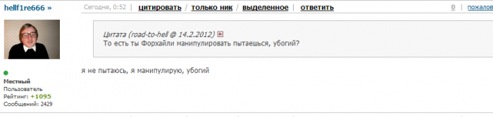 В ходе общения на форуме данный гражданин счел нужным сообщить, что он намеренно пытается манипулировать форматом блогов, путем вброса идиотских сообщений, а все, кто фо фан читает популярные блоги жополизы и отбросы.