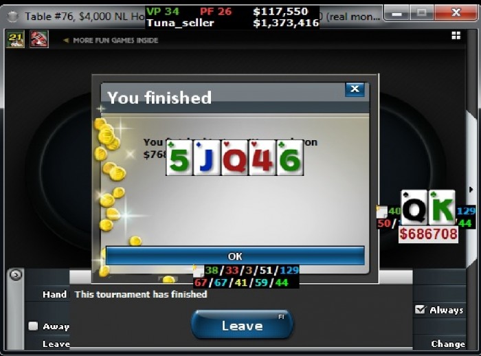 О покере:С покером меня познакомил друг с которым я недолго играл офлайн до закрытия.Потом был коинфлип от ПС с которого я поднимался и как ни странно не слил его сразу.Так была отыгранна куча полтосов,но итог был всегда один-отбил и вывел всё.И вот однажды озарил меня свет ангельской=) и понял я что дальше так нельзя.Снарядившись 2 томами Харрингтона я начал подъём и пришёл к 1.5к и двум румам Betfair(Tuna_Seller) и 888(DiGold888)C 888 я и начинал))В покер пришёл не для того чтобы иметь Н-ную сумму в месяц,а чтобы становиться лучше каждый день и подниматься вверх.Очень мотивировало интервью с Форхейли и,вообще,очень близка точка зрения на покер Ильи Городецкого.Для меня дух соревнования и ощущение победы не сравнимо ни с чем=)