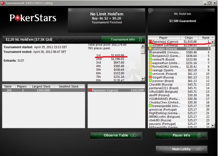 А я титаническими усилиями досидел до ИТМ ))) Есть же первый ИТМ в оффе) Дали 760 долларов за 5 место, потратил я 310 (вход+ребай+аддон). Впечатлений масса :)"