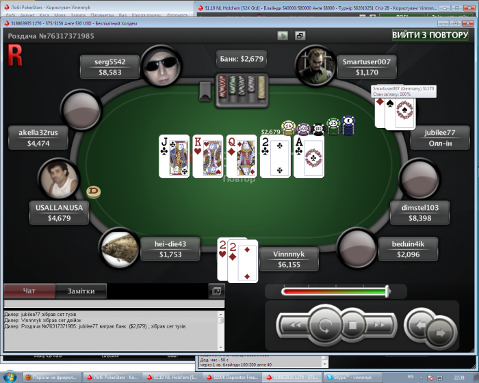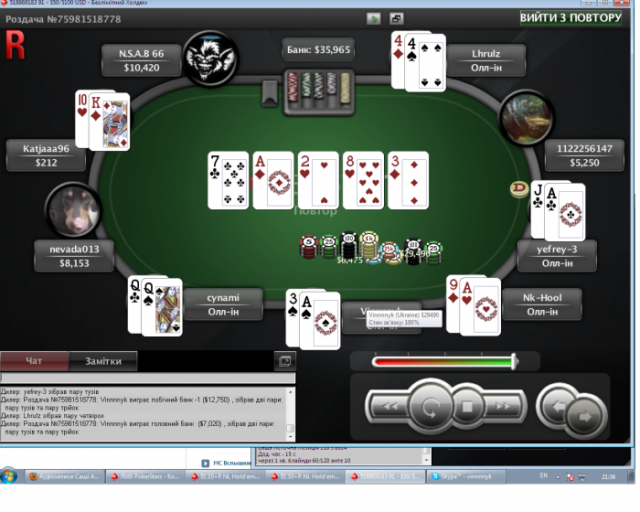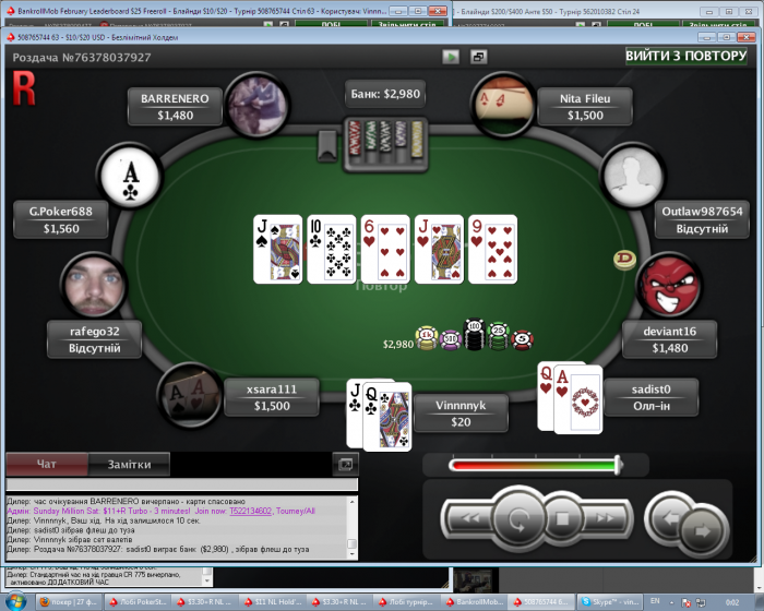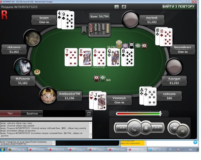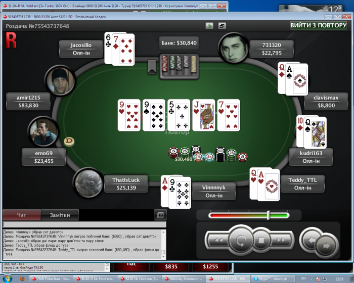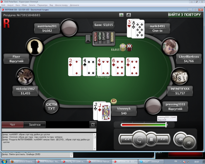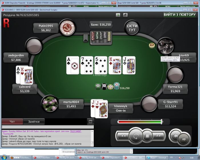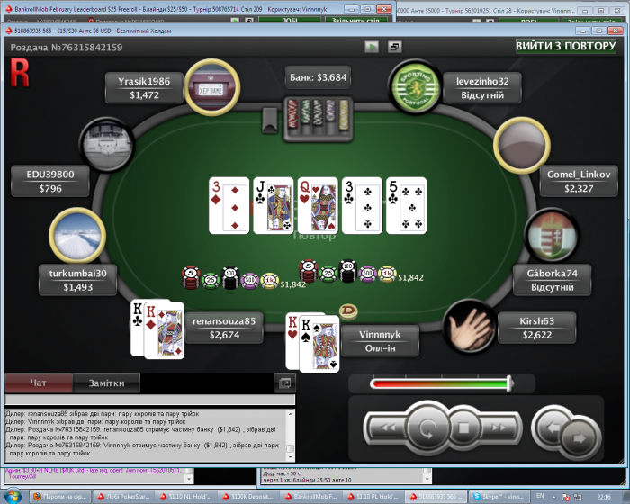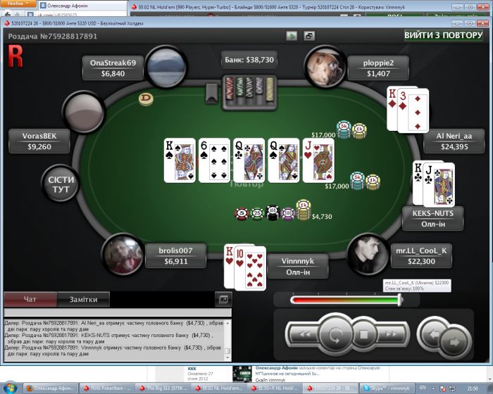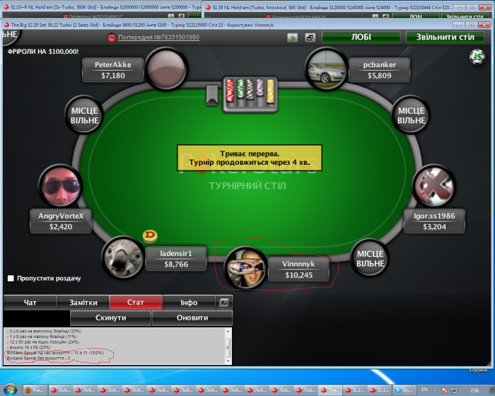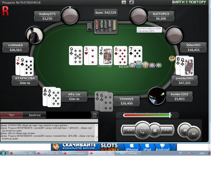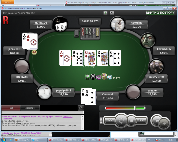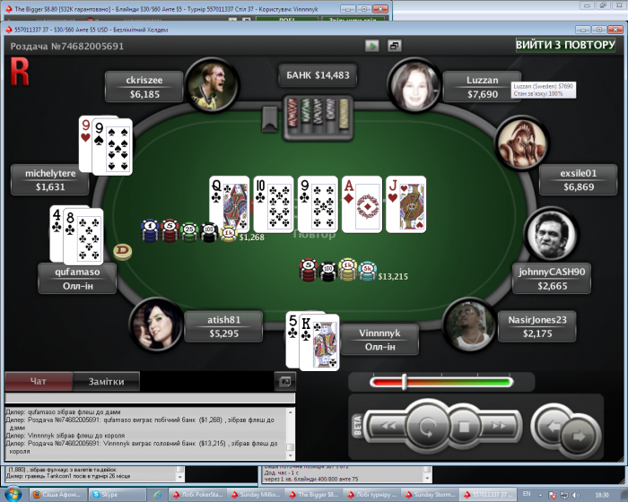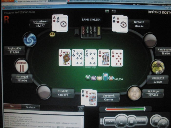 I Poker !!! )) Skype Кто хочет пообщаться и Депнуть меня условия обсудим. Играю Очень долго на покерстрас недавно после регистрацыи поднял 2000$ В первый же месец с ничего можно сказать потом деньги потратил в реале вывел! Начал я играть не по банкролу и понял что хватит страдать не тем надо соблюдать правила! Игрок Ответсвеный я играть могу ночью и днем в любое время как договоримся ... Больше ничем не занимаюсь готов Играть играть играть и выигрывать если проиграю сами увидите как я верю в себя и и Беккера не подведу! Понимаю что на будуеще будем вместе!!! Еще похвастаюсь Играл Сандей милион 1 раз 10А лет покерстарс было ( Занял 3180 место получил 800$ ) стек сожрали блины 100 000к ! (( ну ниче набрался опыта есть видео роздачи как я с КК выиграл у АА и АА ) 4 туза ушло спать)) Если здесь нет ответа от меня лутче в Скайп там я всегда! Предоставлю все чтобы мне поверили... почему так потому что я новинький и все понимаю что много мошейников!!! Ник мой Vinnnnyk (Pokerstars) http://ru.pokerprolabs.com/Vinnnnyk/PokerStars