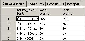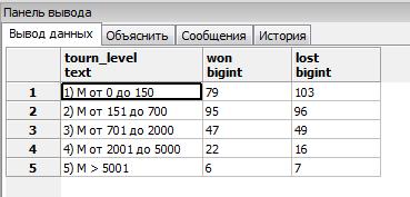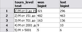 Запускаем запрос на выполнение и видим примерно такую табличку как в аттаче. Первая колонка - уровень блайндов, вторая - выигрыши коинов, третья - проигрыши.
