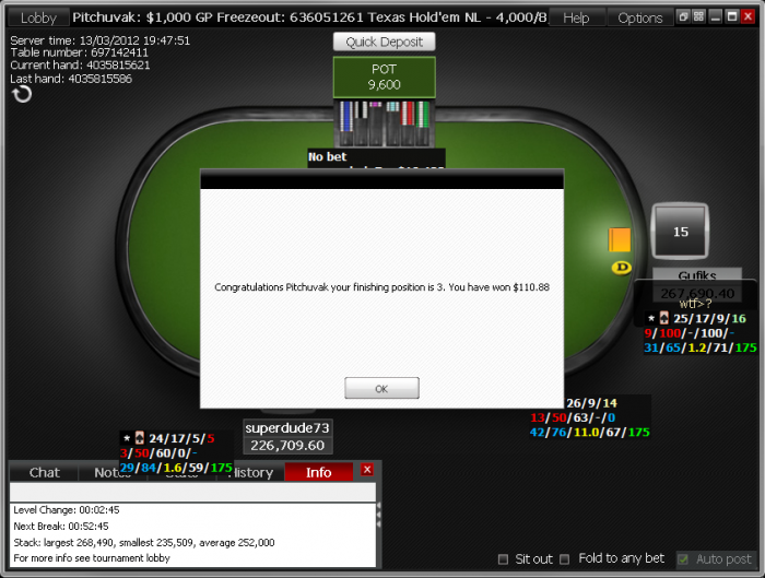 и вот такое!!!!:Poker Stars $5.00+$0.50 No Limit Hold'em Tournament - t25/t50 Blinds - 9 players -