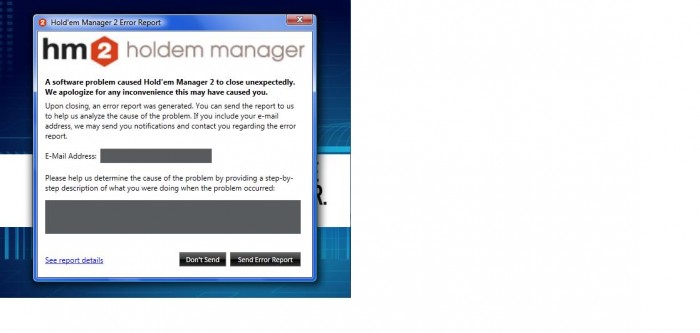 Запустил ХМ2 , он предложил обновиться,я нажал DOWNLOAD! Все шло хорошо,потом он выключился, и я решил его заново запустить(Знаю, сам придурок,но просто забыл что потом идет инсталяция, вообщем вылезло окно инсталяции и тут же начал запускаться ХМ2.Я его сразу же выключил,но инсталяция тоже начала выдавать ошибки ...Теперь при запуски холдема он выдает окно с просьбой указать е-майл и описать суть проблемы(это как я понял,с английский не очень).Вообщем , так как суть проблемы я им описать не могу,прошу помощи у Вас!!!