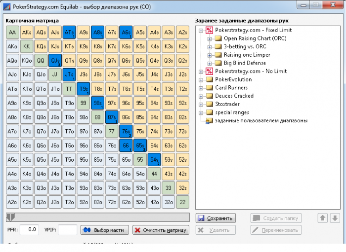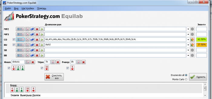 Для начала надо прикинуть диапазон, с которым опп играл лимп-колл, это могут быть одномастные коннекторы, пары 22-99 (начиная с 1010 он, думаю, рейзил бы), слабые тузы. Большую часть этого сора он выкинет на флопе и терне. Допустим, мы решили сыграть ривер чек-колл, вот то, что решит поставить: (остальное сыграет чеком)