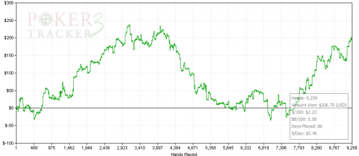 Но она таяла и таяла, карта не шла вообще, редкие разы, когда заходили хорошие тузы, абсолютно не попадал во флоп, а оппы не любили падать на кбеты. В итоге прокидал до стека в блайндов 35-40 (евро 200), докупаться уже не стал, поскольку было поздно. Подарил остатки стека в такой раздаче: