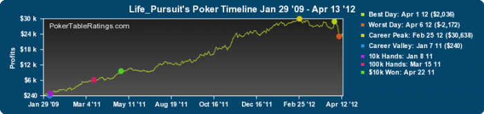 Для тех, у кого это мой первый дневник, если коротко - я играю без банкролла. В начале апреля традиционно начал с $100, сейчас около $1k. В апреле не планирую играть ничего, кроме нл50, а потом все вывести, что выиграю, но что такое планы? Раньше я их вобще презирал, теперь не боюсь строить, но и не поклоняюсь.
