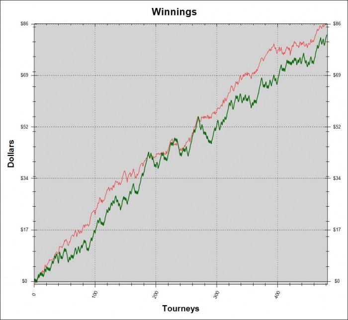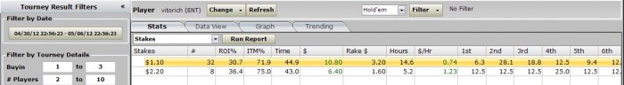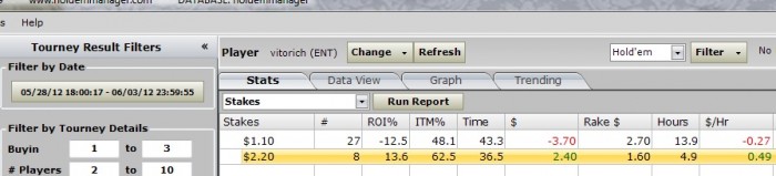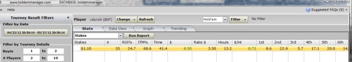 Попробовал фифтики играть, трудно оценить результаты да и статистику в HM почему-то не могу посмотреть по ним. Тем не менее затащил из них пару первых мест. Буду пробовать и дальше по столу параллельно фифтики играть. Сегодня сыграл 7 донов двушки и единички + фифтик -ITM=100% и первое место по за фифтик. Буенос ночес мой читатель!