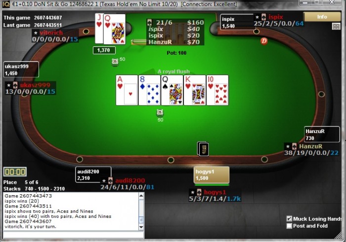 Начал играть на лимите в 2 евро. На этом лимите как-то совсем мало столов собирается, а поле не отличается от единички. Из раздач снова ничего экстраординарного не было. Кроме, пожалуй, как называют игрой по "чуйке". Не сторонник этого но часто себя ловил на мысли "как-то подозрительно мне дают второй раз АА, или там КК", он ты ререйзишь-алын и сливаешь пол стека. Сегодня очередной пример такого состояния был: начало турнира-> самая первая рука АА-> активная игра за столом-> ререйз->алын->удвоился. Вторая рука и чуял я надо сбрасывать, но не смог и думаю что правильно сделал: