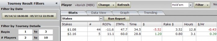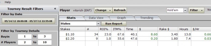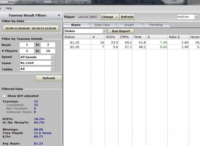 Да да да.... Мало сыграно турниров, просто потому что блин я работаю, в спорт зал и на покер у меня остается всего ничего: 3 дня в неделю по 2-4 часа. Рума не популярная играет максимум 9 тыс. и этот пик игроков длиться около часа.... Закинул туда три еуро и постепенно шагами мастодонта иду к своей цели. А цель одна- хочу стричь капустку покером, если не основной, то хотя бы дополнительный заработок. Так как играю малое количество турниров, то буду суда выкладывать недельные отчеты о результатах(weekly reports), раздачи,мысли.